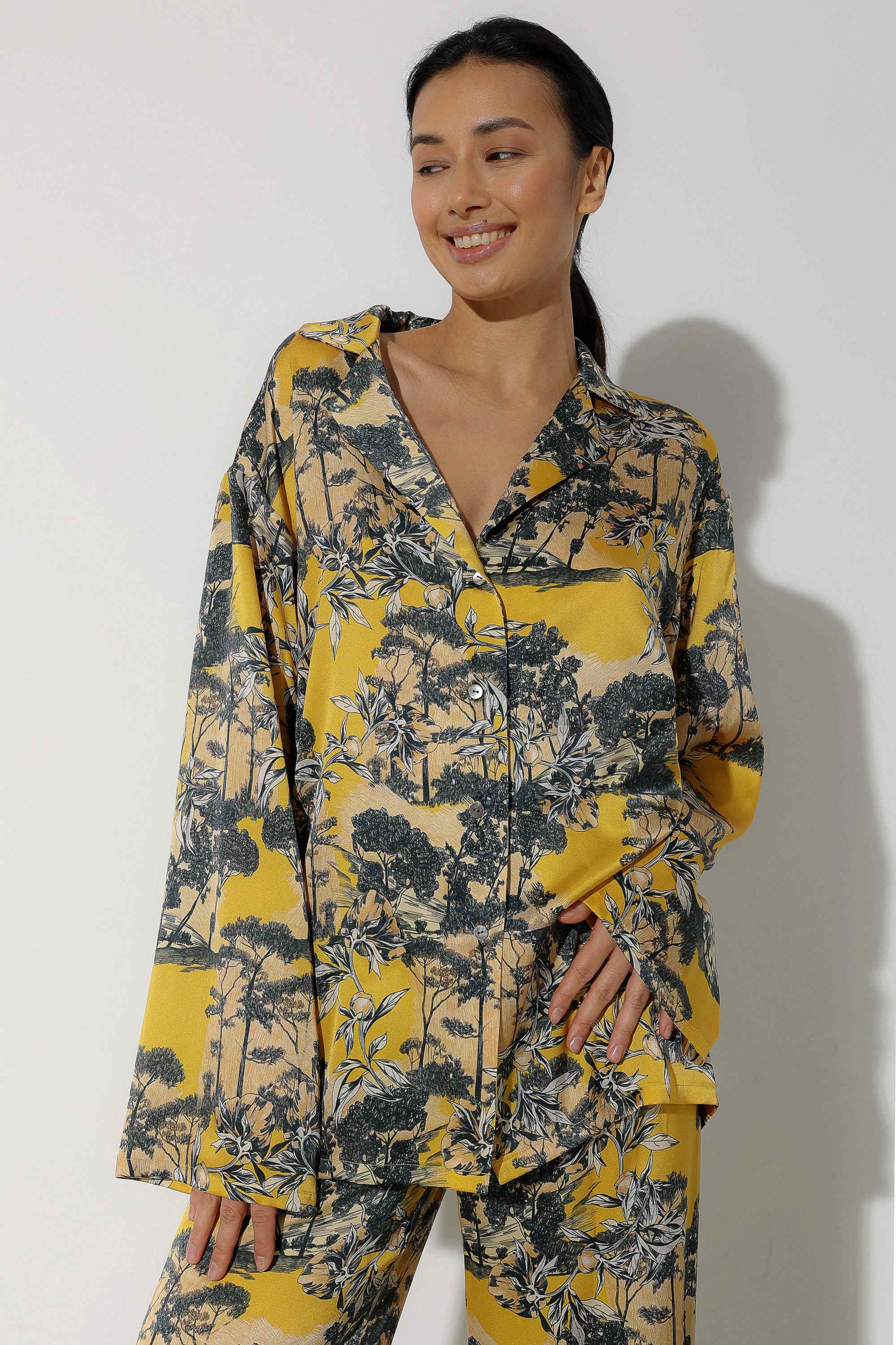 Floral Yellow Long Pajama Set with Pockets for women Luxurious ...