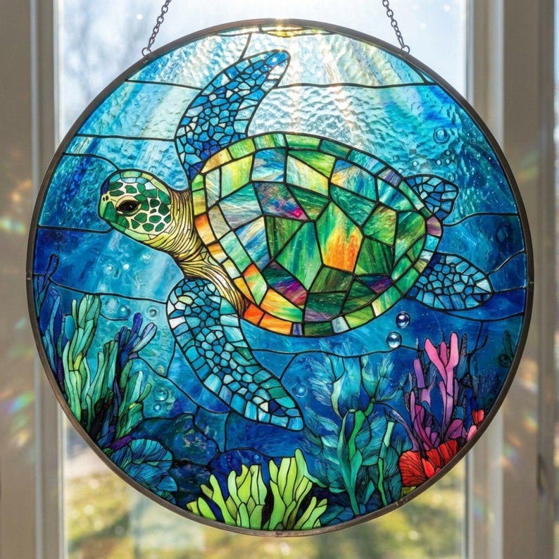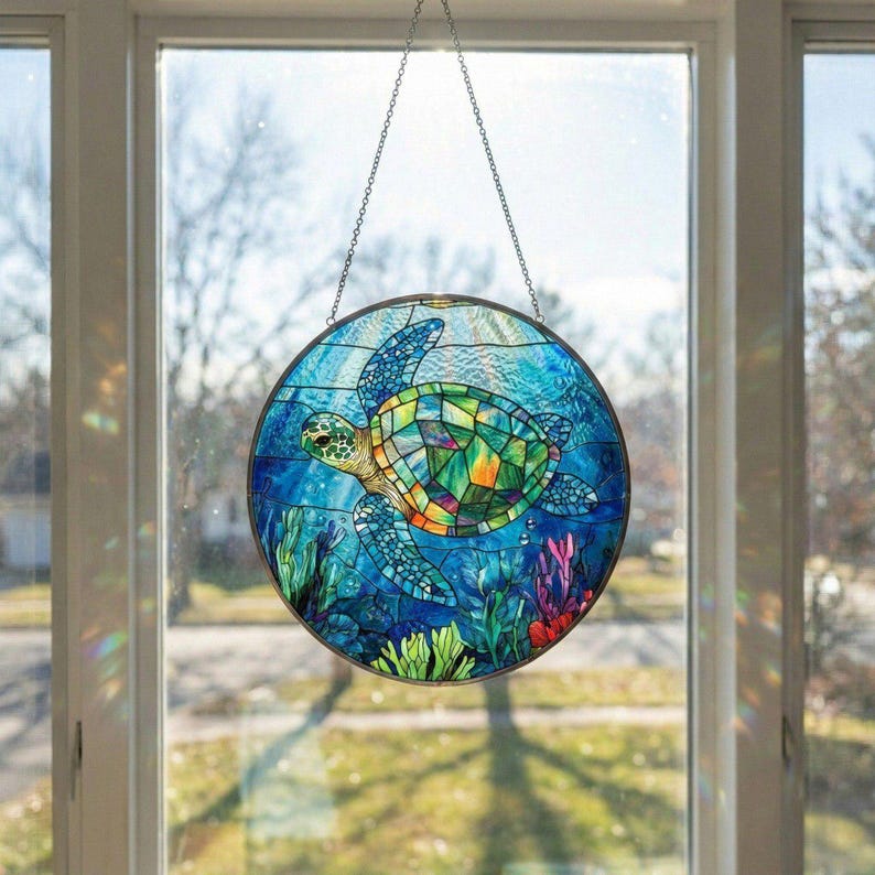 Sea Turtle Stained Glass Suncatcher, Ocean Window Hanging Decor ...