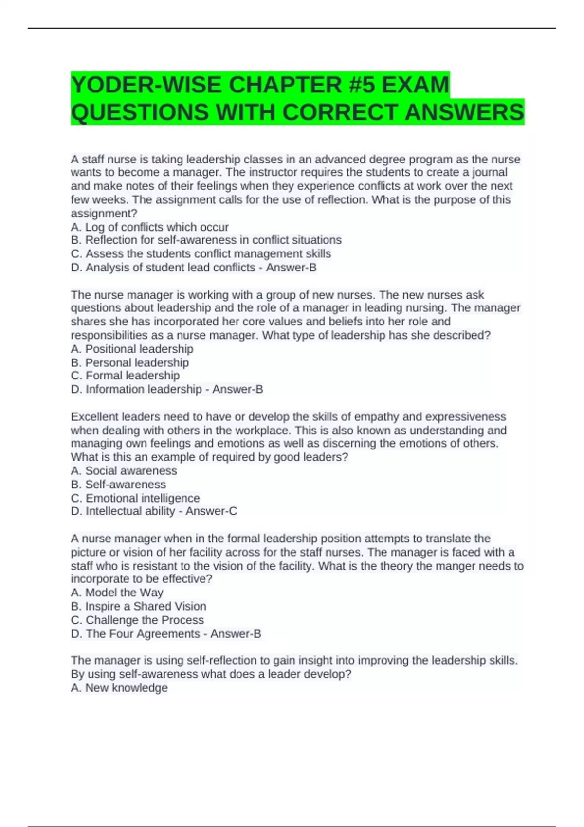 Leadership Yoder-Wise Final Exam Questions With Complete Solutions ...