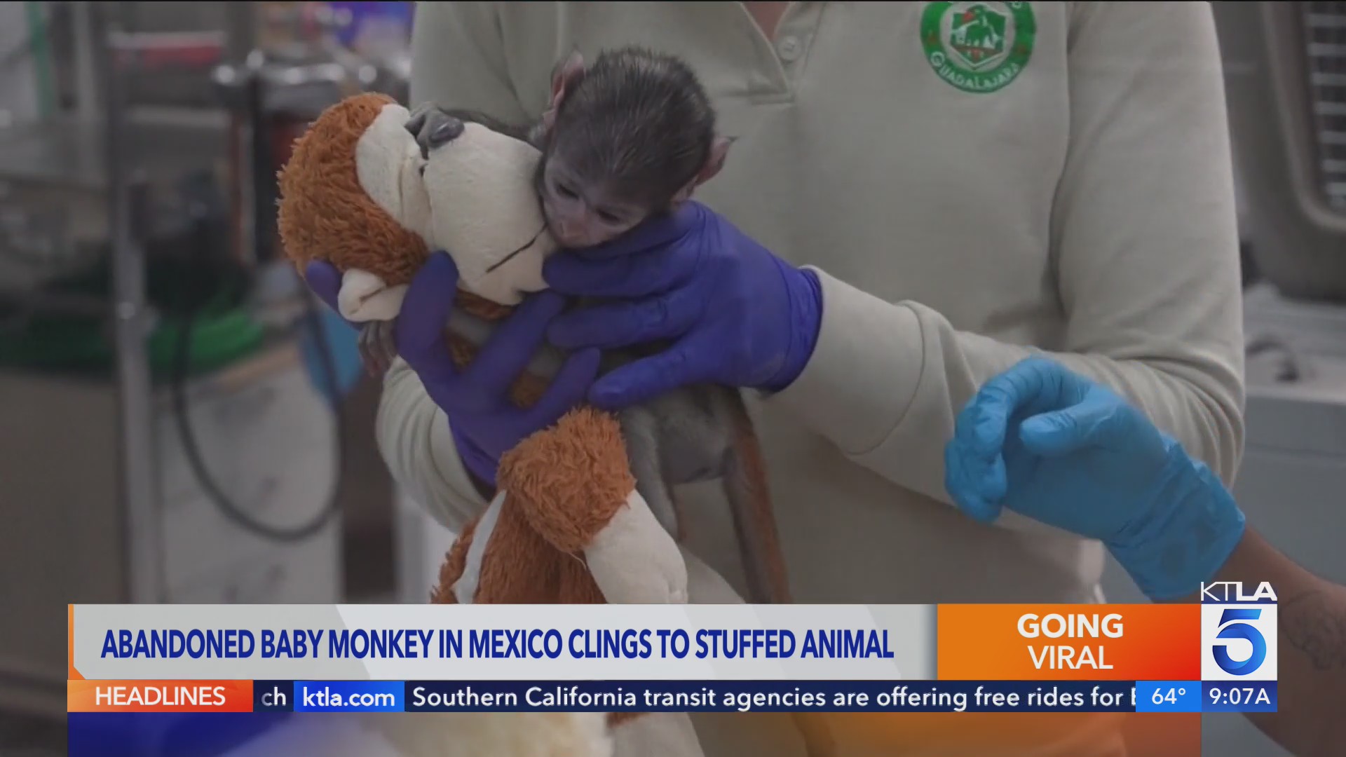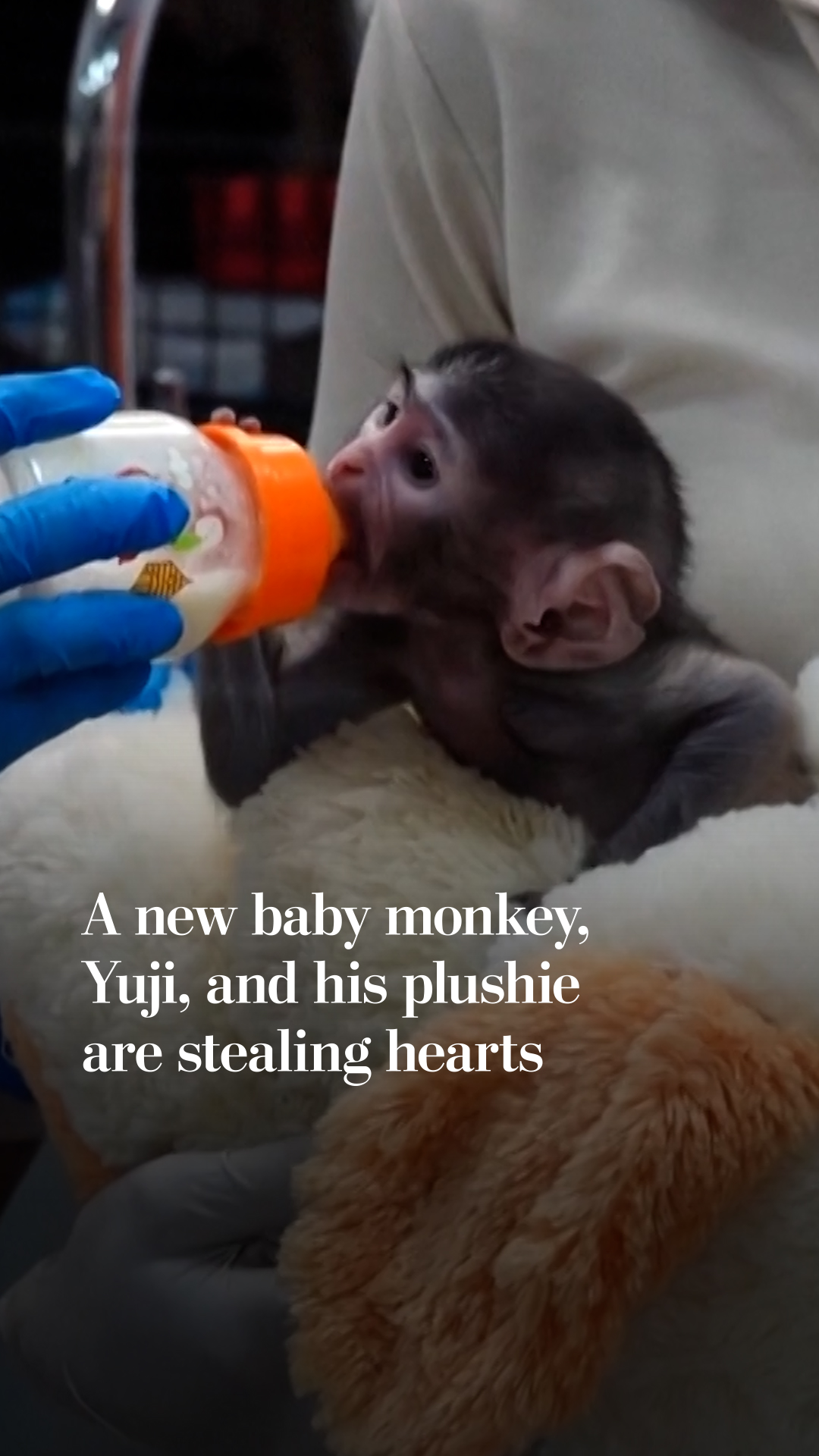 Tiny abandoned monkey named Yuji clings to stuffed animal for comfort