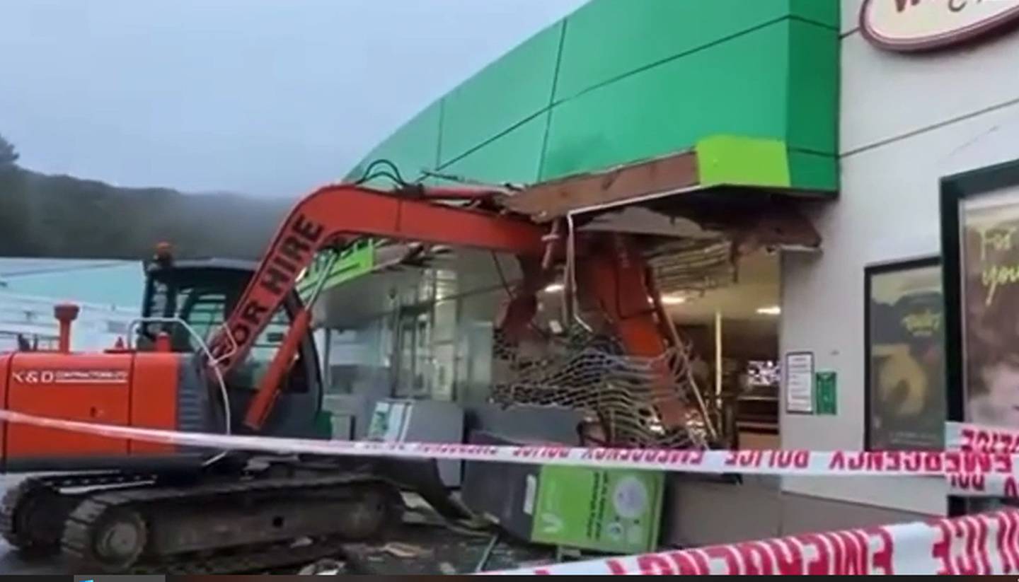 Stolen excavator used in gas station ram raid, building left unstable