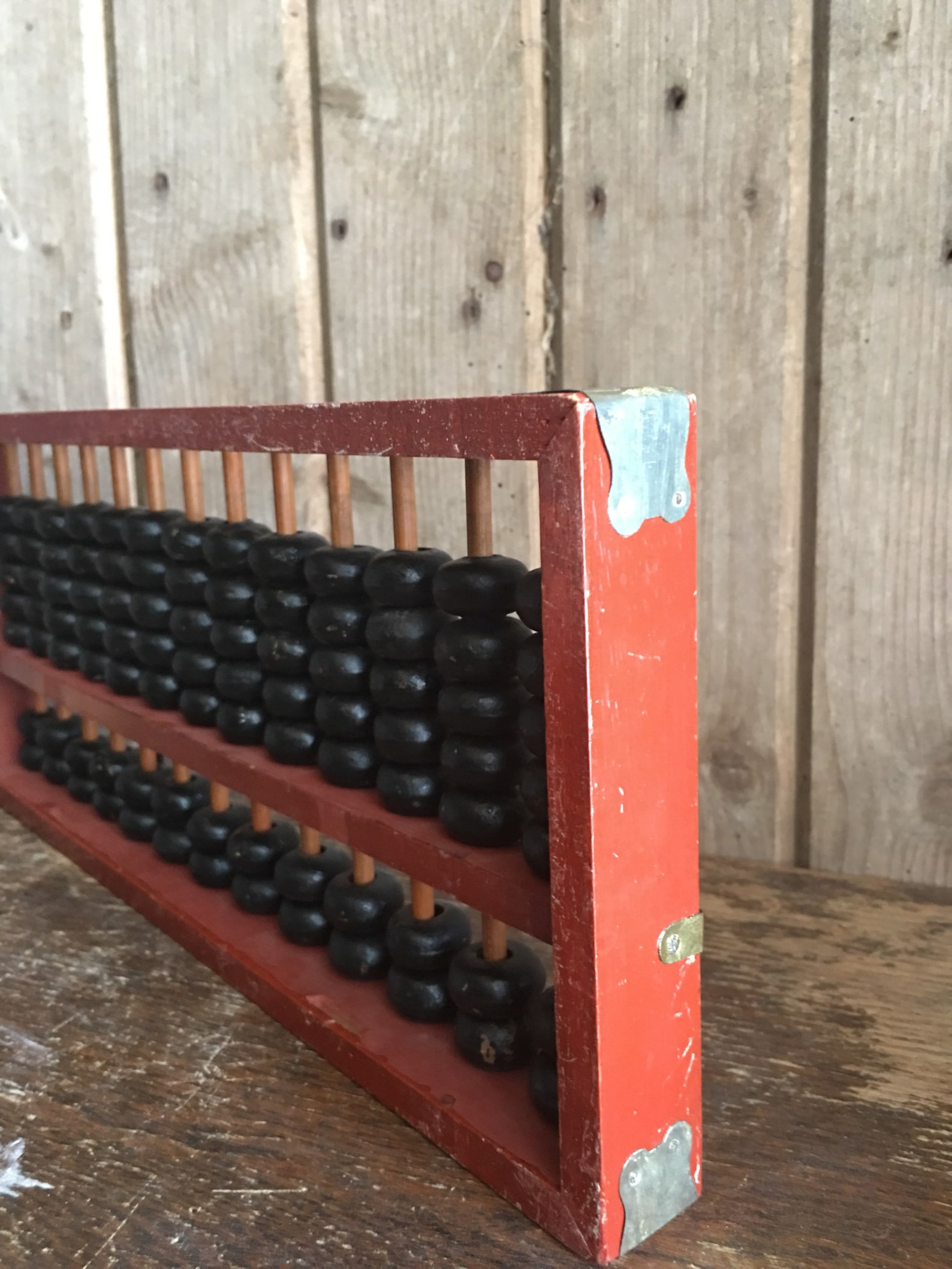 Old and ancient abacus made of wood and attached with a metal plate. On ...