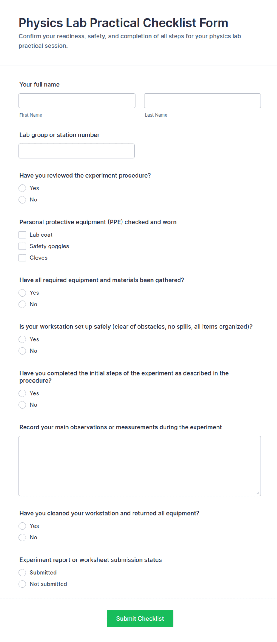 Physics Lab Practical Checklist Form Template | Jotform