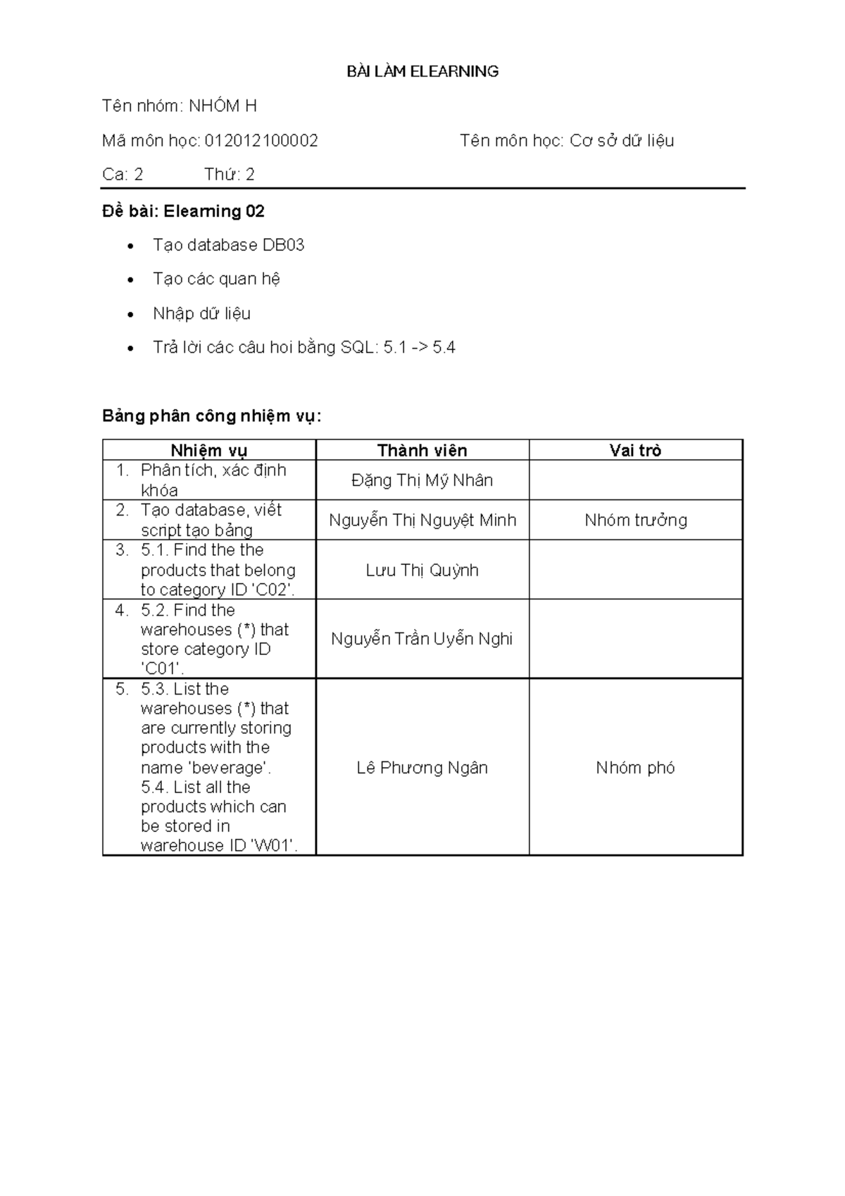 BÀI LÀM ELEARNING 012012100002 - Cơ Sở Dữ Liệu Nhóm H - Studocu
