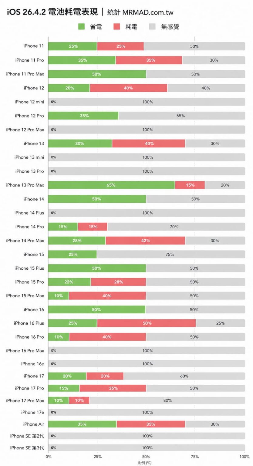 更新iOS 26.4.2耗電嗎?新舊款iPhone電池續航力實測數據一次看 - 瘋先生